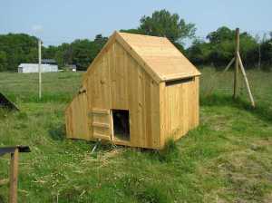 Mike has made some houses with plywood but then decided to make a ‘pretty’ one and this is it. The hens have been underwhelmed but are gradually getting used to it. It is designed for large hens and we have used it for our pure breed hens (Welsommers, Light Sussex and Cream Legbars), although the smaller Ludlow Legbar hybrids like laying their eggs in it even though it’s not their house. They even fly over the fencing to get to it, so it has an appeal that eludes us.