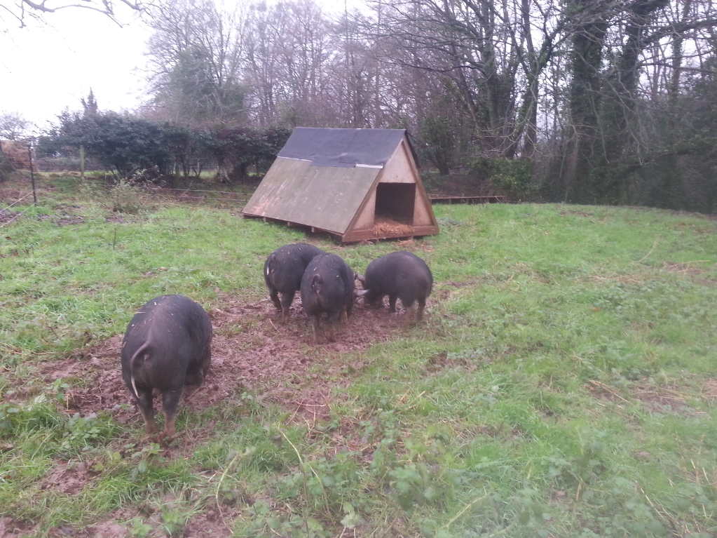 So here we go again, it’s time to move the pigs to their winter quarters. I was preparing myself for it to take all morning after last years attempts. I led the pigs down the field to their new area although the little boar ran back to Mike and wouldn’t come with the girls, so I had to tempt him with food on his own. Once he’d got the idea he followed me and was reunited with his girls. Then we set about moving the ark itself. This was amazingly easy with the forks on the tractor and this was Mike pulling it out of the mud.