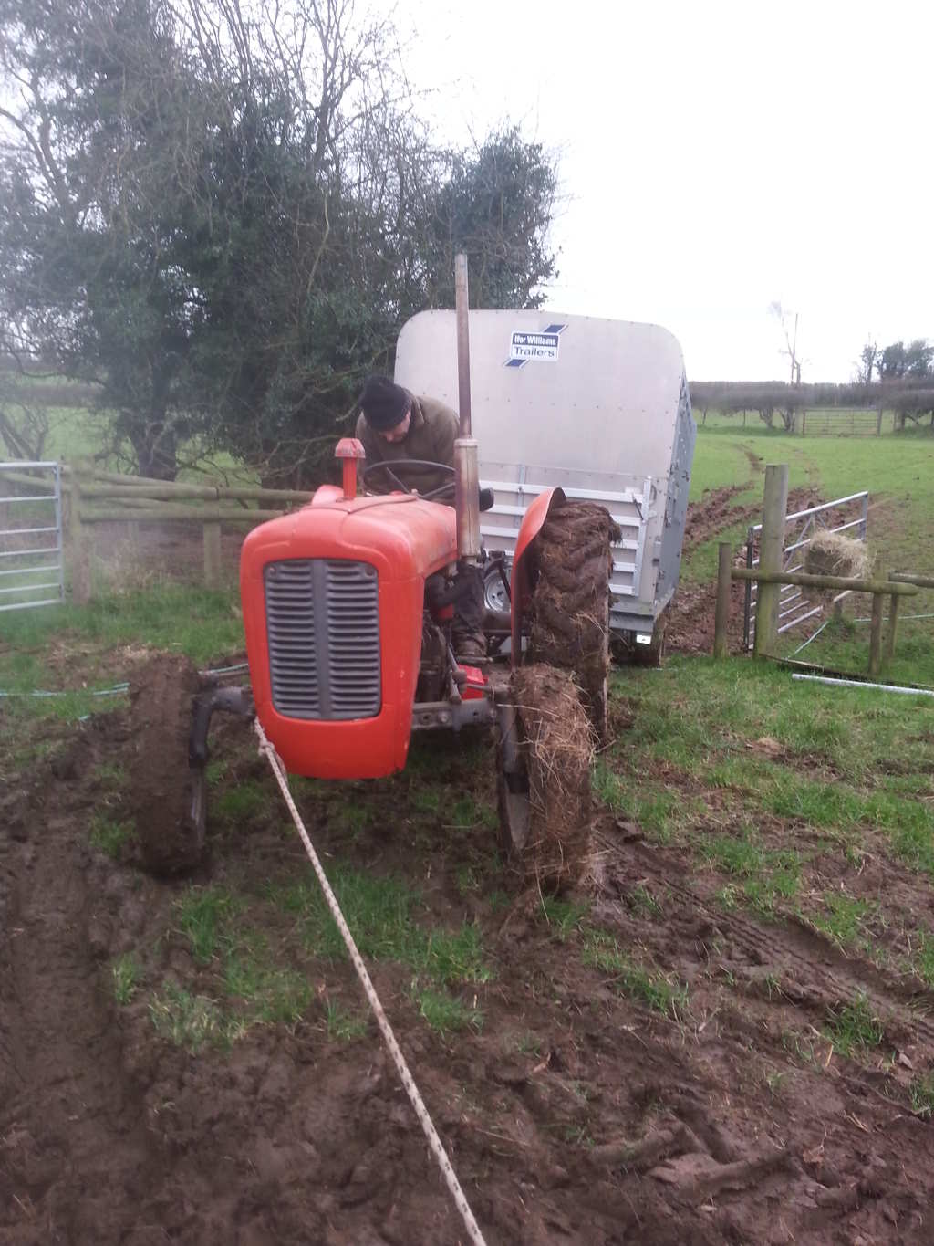 Mike used the tractor because we knew the fields were still quite wet. However, to get to the pig field requires us to go down a muddy slope and up a fairly stiff grassy one. Needless to say the tractor/trailer got stuck and no manoeuvring could free it. So, out came Toad the Defender. We got into our field via our neighbours (thanks Bob) and then pulled the tractor with one of our old sailing ropes. It was touch and go, but with a bit of attitude we managed to pull the whole rig free. The photos show the rope attached when it then got stuck coming back into the small paddock. Again the Defender managed to get it out although because of the angle of the rope we nearly took the gate post off.